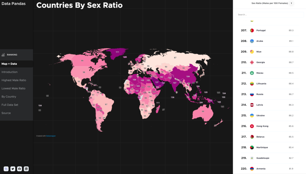 To those who would like something more visual and interactive like a global map of which countries have the highest female to male ratio, I recommend going to DataPandas page to see their beautifully laid out map of countries based on gender ratio. From doing research about Data Panda’s numbers, they also use the data from the United Nation Department of Economic and Social Affair website.